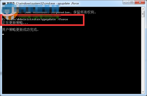 3、删除了文件之后接着将电脑中的dos命令打开,然后输入命令:gpupdate /force