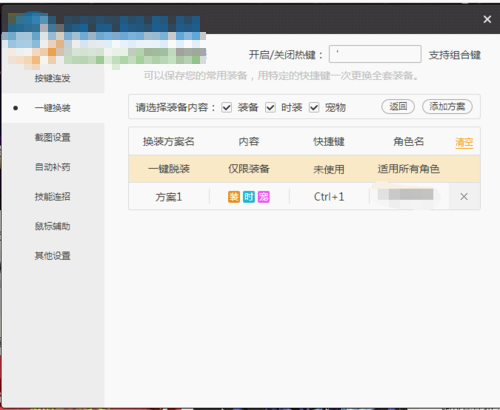 6、开启一键换装功能,并设置一个无其它程序占用的快捷键即可。