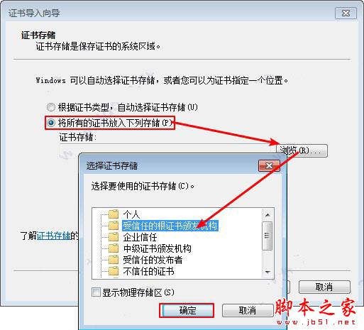 9、在“证书导入向导”窗口中我们选择第二项“将所有的证书放入下列储存”再单击“浏览”选择“受信任的根证书颁发机构”即可点击“确定”。