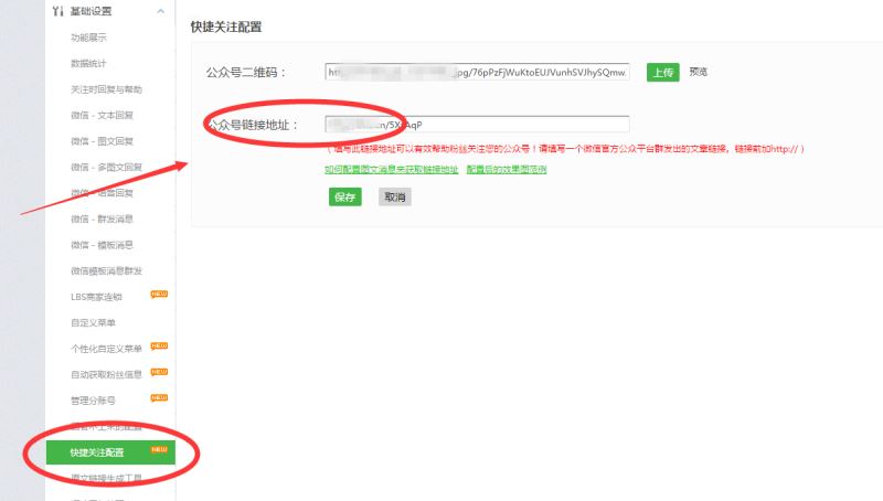 第二步:点击功能管理-左侧自动获取粉丝信息,选取获取昵称头像全部信息,保存;然后左侧点击快捷关注配置,填写一条公众号关注链接和设置关注语;接下来点击左侧游戏互动营销里面的游戏设置,把关注链接再粘贴一遍,保存