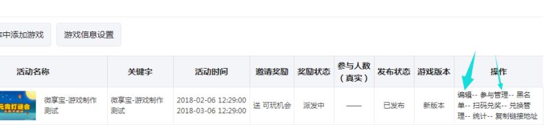 第六步:回到制作后台,在我的游戏,可以看到参与者信息和是否获奖的,还可以点兑奖管理,是要活动结束之后,才可以使用的;点统计,里边就是游戏的详细参与情况,还可以查看获奖情况的