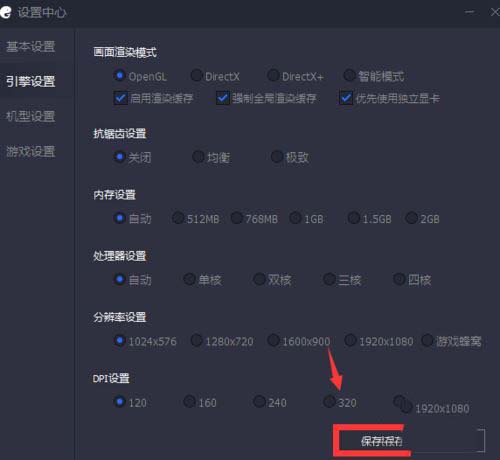 接下来再展开引擎设置,总之一句话,往最低了调就是了,调好后点击【保存】。
