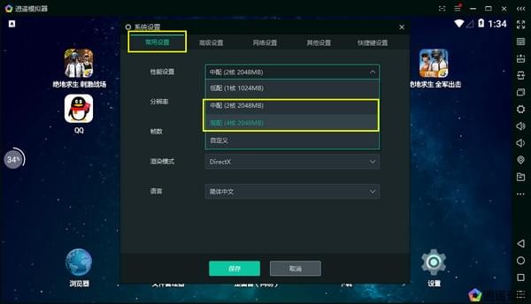 二、请在设置里面将显卡渲染模式设置成DX模式,并将安卓模拟器设置成为中配或以上