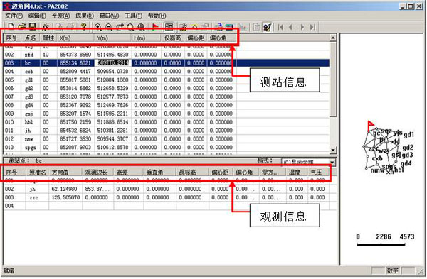 2、PA2005为手工数据键入提供了一个电子表格, 以“测站”为基本单元进行操作, 键入过程中PA2005将自动推算其近似坐标和绘制网图。