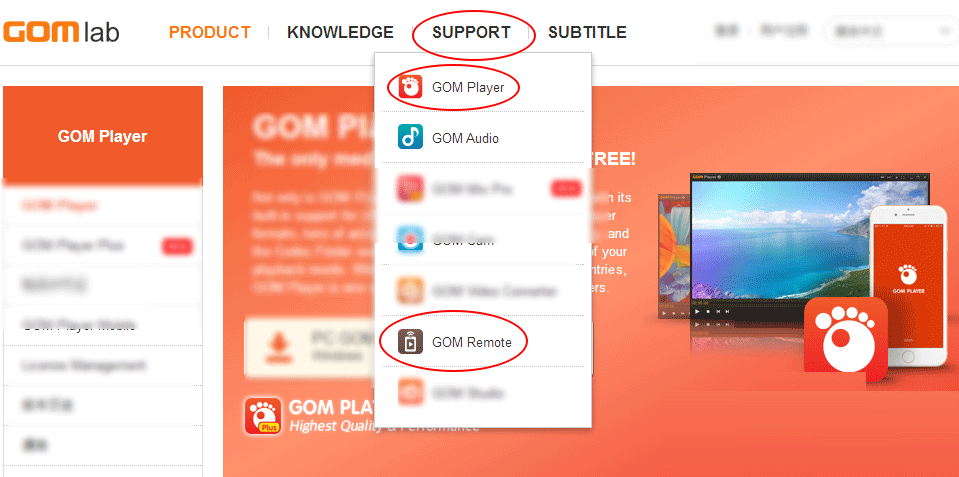直接在本站下载GOM Remote,或者先进入官网点击support这里下载player安装,然后再次点击图二的support选项,选择remote然后点击版本点击下载,安装都是双击EXE就可以了。