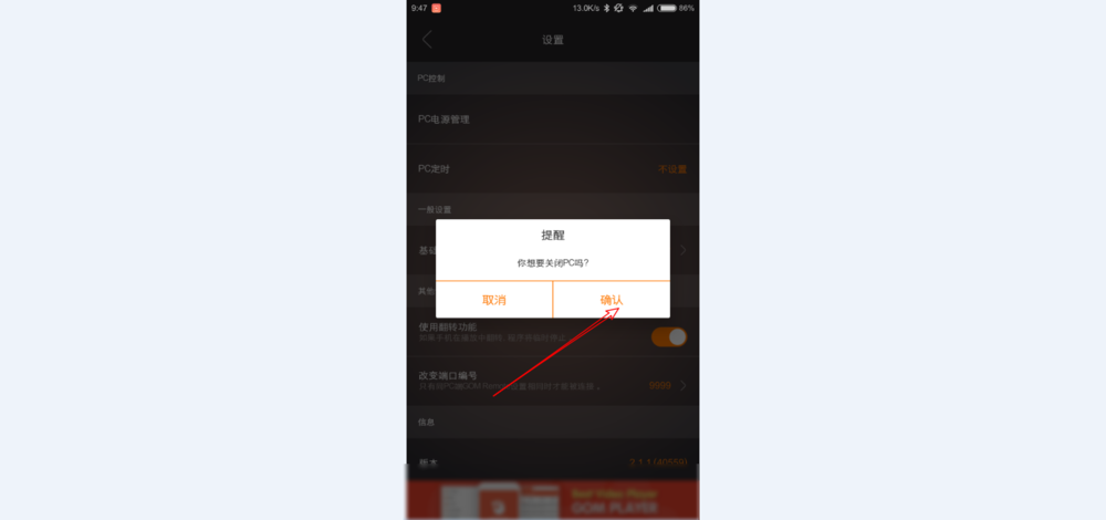 点击手机端设置选项,然后选择PC电源管理,PC结束确定后就会自动帮助远程关闭计算机。方便在看完电影后跑过去关机。