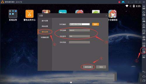 打开雷电模拟器,点击右侧的设置,然后点击属性设置,进入设置页面,更改手机品牌和手机型号。例如:手机品牌:xiaomi ,手机型号:mix。更改好设置之后,点击保存,然后重启模拟器。
