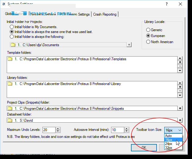 与其他现代Windows应用程序一样,ISIS通过使用工具栏提供对其许多命令和模式的访问。工具栏可以拖动到ISIS应用程序窗口的四个边中的任何一个。如果您有4K显示器或将机器设置为使用高DPI设置,则图标将自动升级。如果没有,则可以从系统菜单上的系统设置命令强制它们。然后您需要关闭并打开Proteus才能使更改生效: