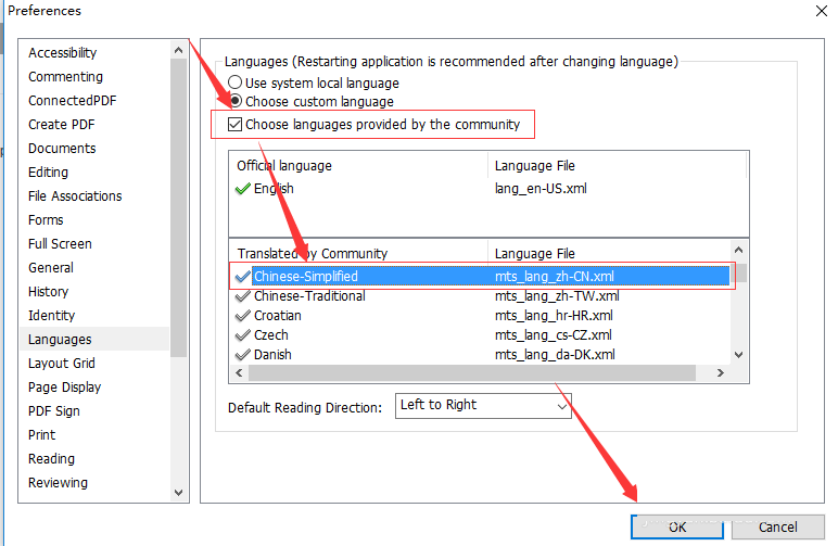 5、选中 Choose languages provide by the community, 然后下拉列表找到 Chinese-Simplified并鼠标单击,然后选择OK键: