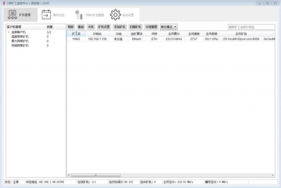 2.打开软件后我们会看到如下界面,在这里我们可以对所有矿机进行监控管理;