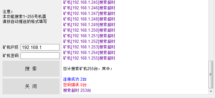 然后点击搜索,内网IP段的所有矿机都会被自动添加进来;