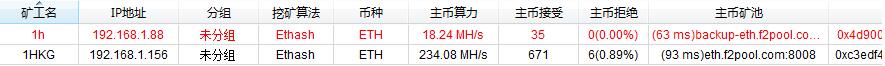矿机上线后,我们能看到矿机的各种信息,当然有问题的矿机,比如算力低,温度高的矿机会在列表里红字显示,并会出现在左边相应异常分组里,如下图;
