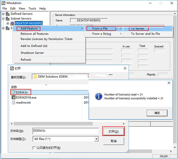 依次选择Subnet Servers—HOSTNAME(你电脑名称)—>Add Featurre—>From a File —>to Server浏览选择EDEM.lic许可证文件打开即可。