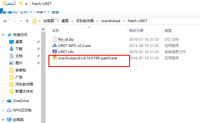 1、打开Patch-URET文件夹,这里复制vcard.wizard.v.4.10.0196-patch.exe到软件的安装地址