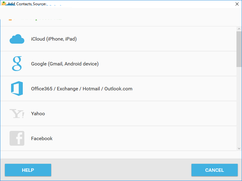 8、Add Contacts Source就是添加联系人来源界面,可以选择Yahoo、Facebook等联系人