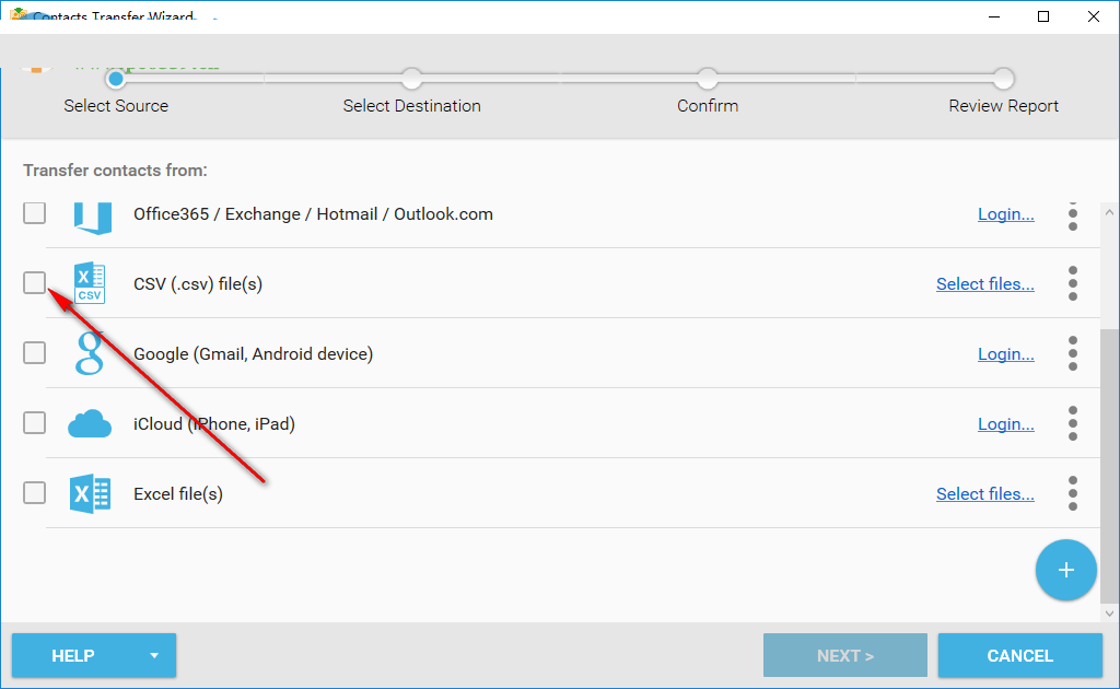 选择vCard(vcf)文件作为源,然后单击“下一步”;