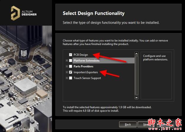 3、继续点击Next,显示如图所示安装功能选择对话框,选择需要安装的组件功能。一般选择安装图示箭头指示的“PCB Design”、Importers\Exporters 两项即可