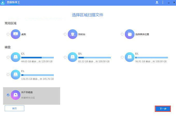 然后,点击“下一步”,选择需要软件扫描的区域,便可搜索丢失的文件。扫描的区域分为“常用区域”和“硬盘”。