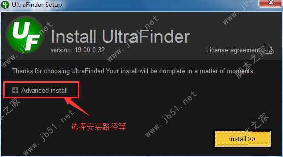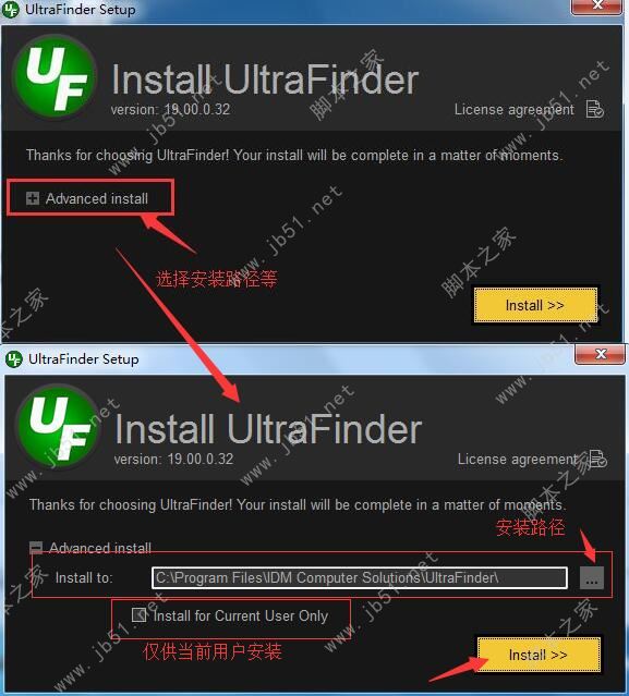 3.安装路径选择默认(默认路径:C:\Program Files\IDM Computer Solutions\UltraFinder\),“仅供当前用户安装”这项看用户心情吧!选择完成后点击install开始安装,如图