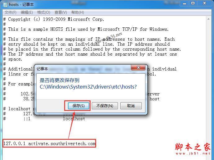 12、在hosts记事本中添加"127.0.0.1 activate.southrivertech.com",然后保存