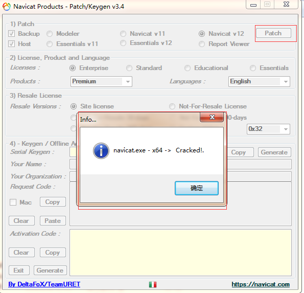 2、点击右上角的patch,选择到你安装路径的navicat.exe,点击确定,提示 navicat.exe - x64 -> Cracked.