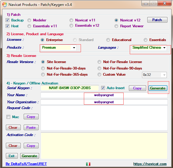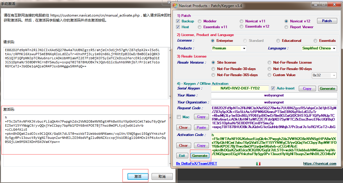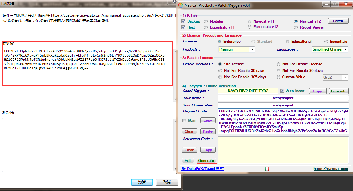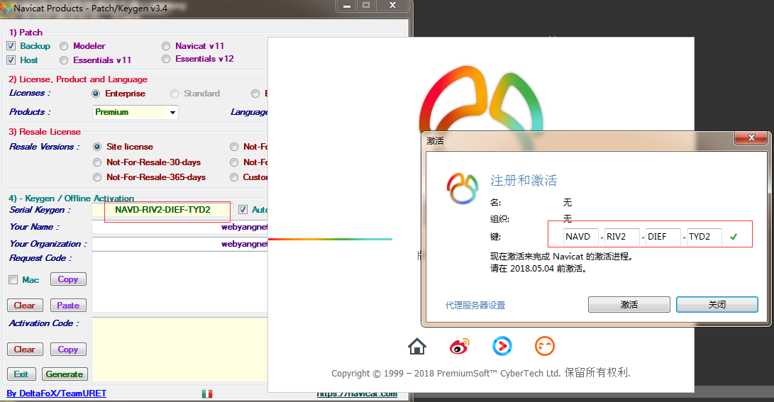 4、把生成的key输入到navicat.exe的激活码里面去,这一步有可能会提示秘钥不对。如果不对,在注册机重新生成一个即可。