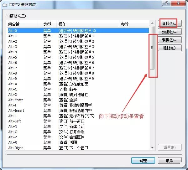 在自定义按键窗口里,可以看到当前键的设置,可以看到系统默认的快捷按键的一个列表。可以拖动竖向滚动条查看列表下方的快捷按键,也可以使用右侧的一个查找功能查找快捷按键。