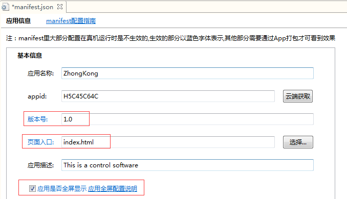 appid:点击云端获取。版本号:根据需要来编辑。页面入口:默认是index.html,根据自己项目需要,更改APP的启动页面。应用描述:自己随便填。应用是否全屏显示:勾上就全屏显示。