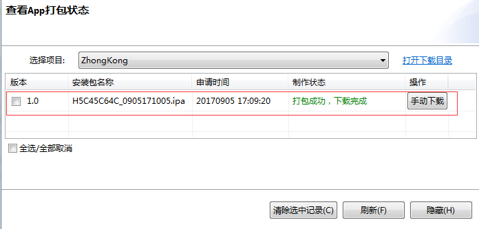 等打包成功,就可以点手动下载,通过第三方工具 苹果助手安装到ipad上了。