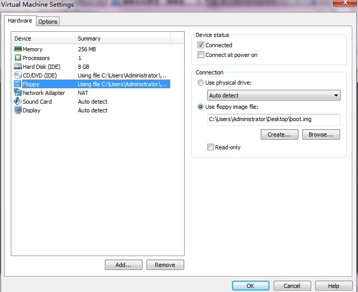 后面的事就好办了,直接在wmware创建一个空的虚拟机,在设置中将Floppy的路径设置为上面制作的引导扇区的路径就ok了,如下图那样: