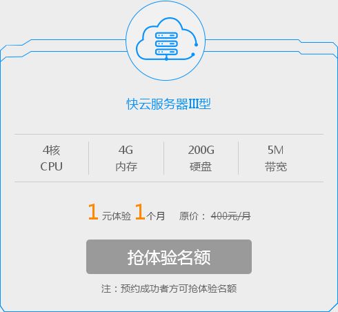 继快云服务器产品推出已经3年之久,近日快云依托多年云计算研发经验,推出新一代快云服务器产品,盛大开启公测。凡新用户注册仅需1元即可体验配置高达4核4G带宽5M硬盘200G SSD,高性能快云服务器全新上云体验。