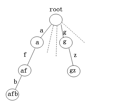 下图为一个针对字符串排序的Trie树(我们假设在这里字符串都是小写字母),每个结点有26个分支,每个分支代表一个字母,结点存放的是从root节点到达此结点的路经上的字符组成的字符串。