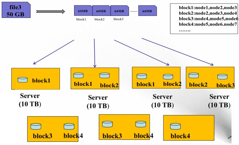 一个50G的文件上传到HDFS上,首先该文件被切割成了若干个64MB的block,block1在node1,node2,node3上存储了3(默认3个,可以设置)个副本,block2在node2,node3,node4上存储了3个副 本block3....直到所有的block都存储3个副本;
