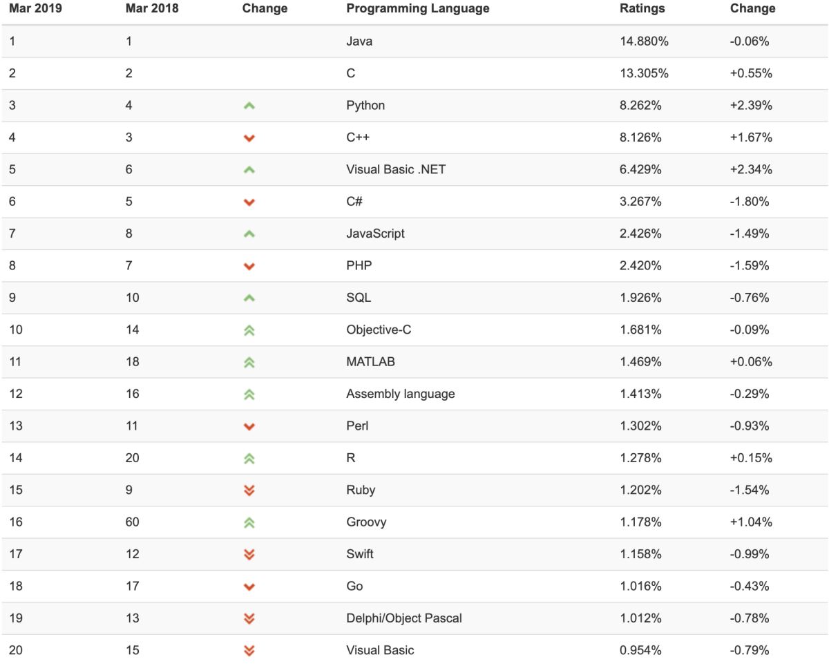 就是TIOBE最主要也是编程行业中最重要的一个排名榜,它衡量目前各个语言的热度,下面是2019年3月的指数榜单以及指数曲线