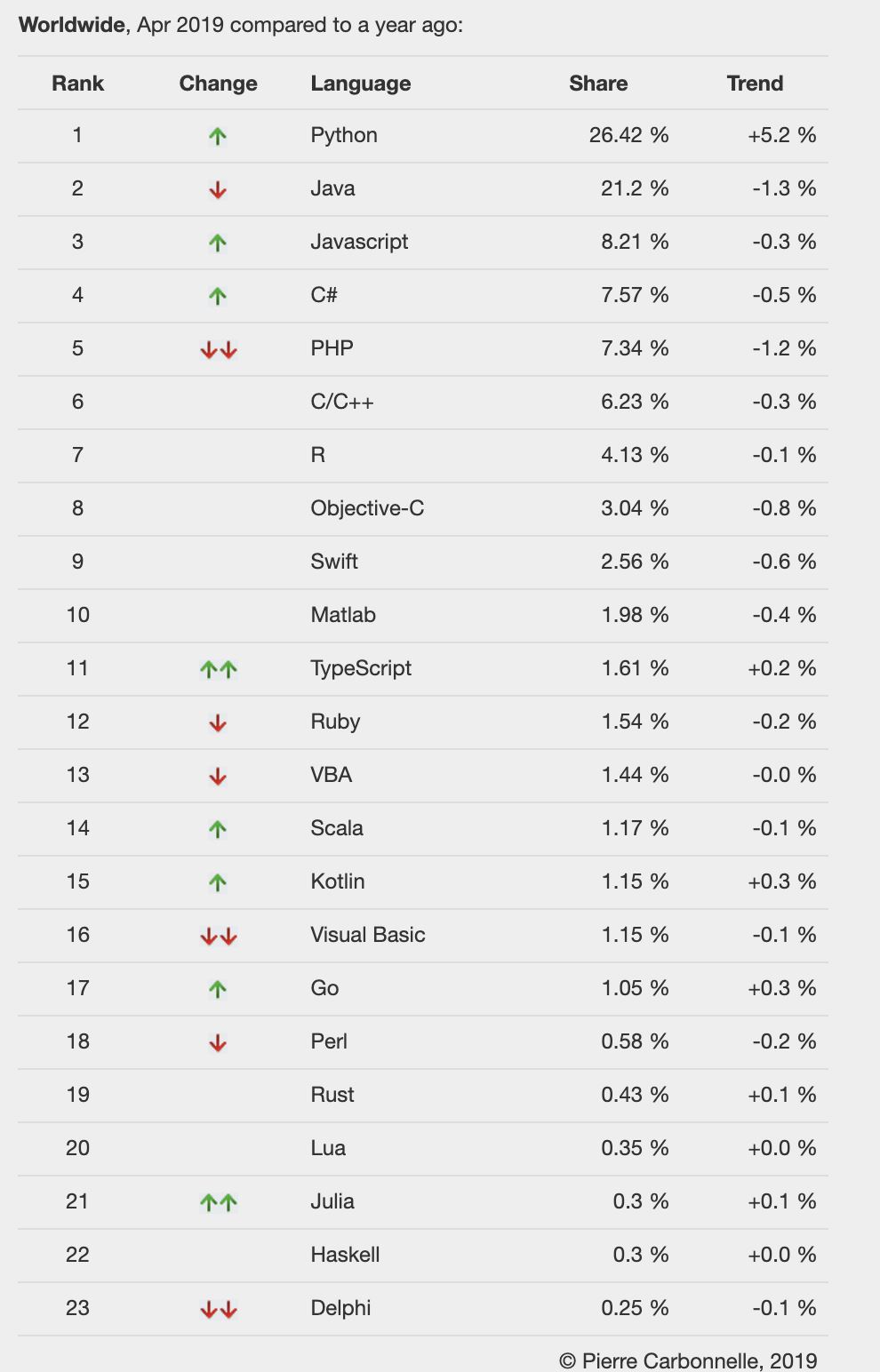 既然PYPL数据只来自Google,所以我觉得很难代表国内的一个流行趋势,更多的是一种国际性全球性的语言流行趋势,下面是2019年4月编程语言流行的排行榜。