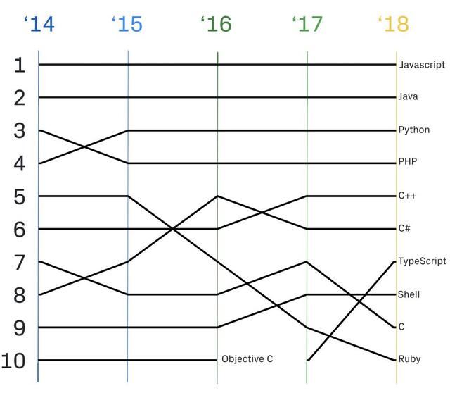 GitHub的“Octoverse”报告有很多有趣的数据,以下数据涞源2018年度报告: