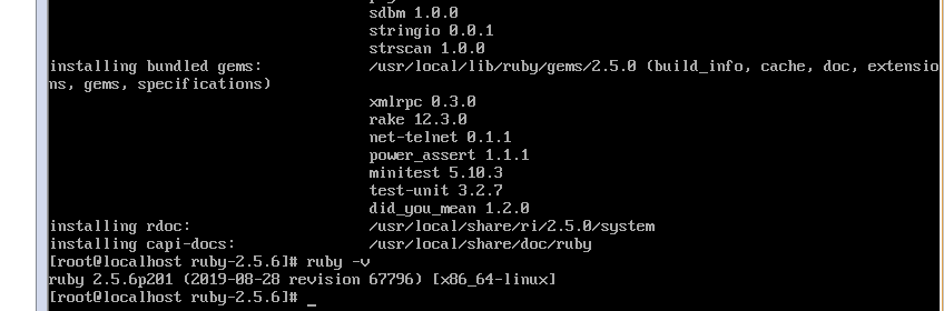 mkdir /usr/local/ruby //创建ruby工作目录 cp ruby-2.5.6.tar.gz /usr/local/ruby //将安装包拷贝到该目录下 cd /usr/local/ruby //进入ruby工作目录 tar -vxf ruby-2.5.6.tar.gz // 解压缩 cd ruby-2.5.6/ ./configure make && make install