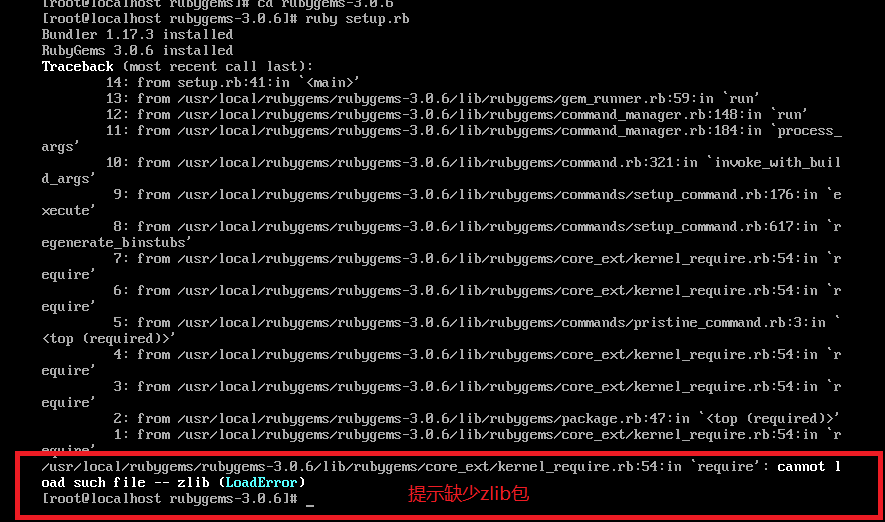 mkdir /usr/local/rubygems //创建rubygems工作目录 cp rubygems-3.0.6.zip /usr/local/rubygems //将安装包拷贝到该目录下 cd /usr/local/rubygems //进入ruby工作目录 unzip rubygems-3.0.6.zip // 解压缩 cd rubygems-3.0.6/ ruby setup.rb