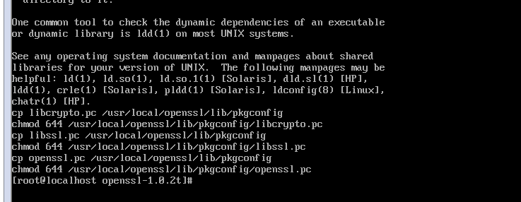 mkdir /usr/local/openssl //创建openssl工作目录 cp openssl-1.0.2t.tar.gz /usr/local/openssl //将安装包拷贝到该目录下 cd /usr/local/openssl //进入openssl工作目录 tar -vxf openssl-1.0.2t.tar.gz // 解压缩 cd openssl-1.0.2t/ ./config -fPIC --prefix=/usr/local/openssl enable-shared ./config -t make && make install