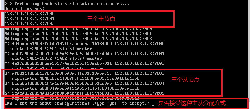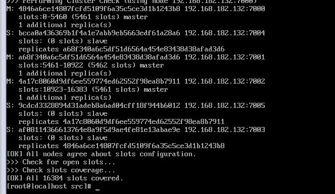 ./redis-trib.rb create --replicas 1 192.168.182.132:7000 192.168.182.132:7001 192.168.182.132:7002 192.168.182.132:7003 192.168.182.132:7004 192.168.182.132:7005