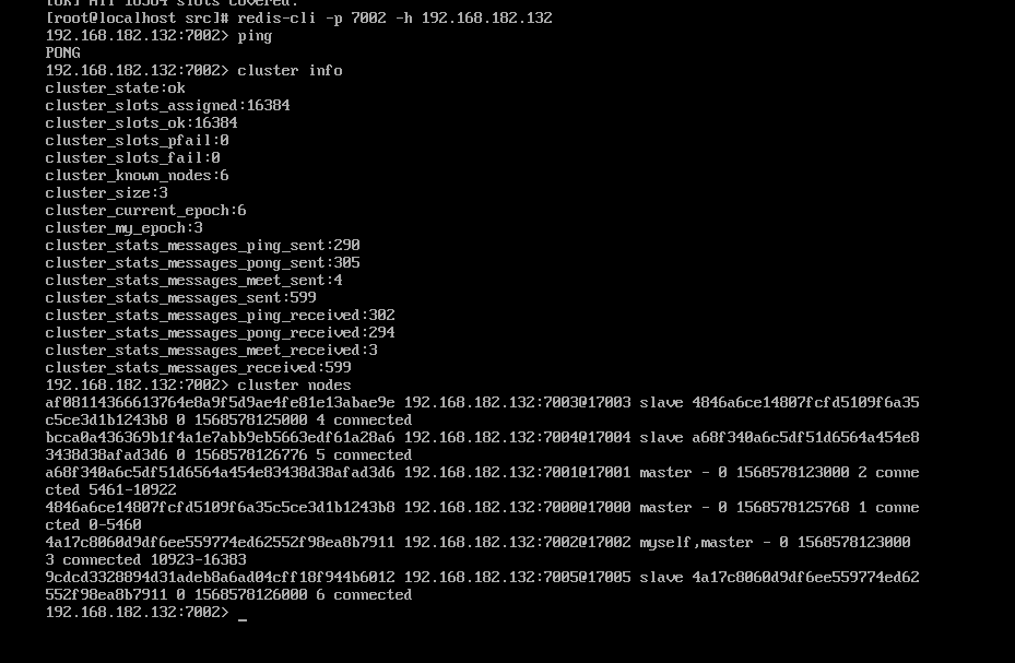 redis-cli -p 7000 -h 192.168.182.132 -c cluster nodes