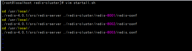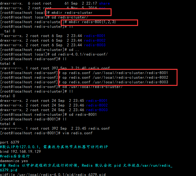 创建redis-cluster目录,再创建redis-8001,redis-8002,redis-8003节点目录,再把redis-conf分别复制到节点目录下
