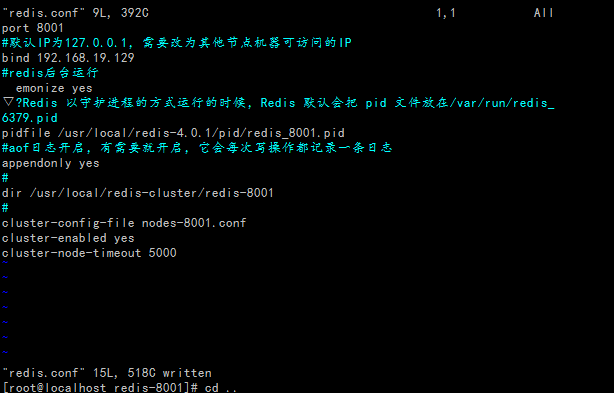 分别修改节点下redis-conf文件,由于在一台机器(192.16819.129)上,因此每个实例应该有不同的端口;同时,每个实例显然会有自己的存放数据的地方;开启AOF模式;开启集群配置;开启后台模式;
