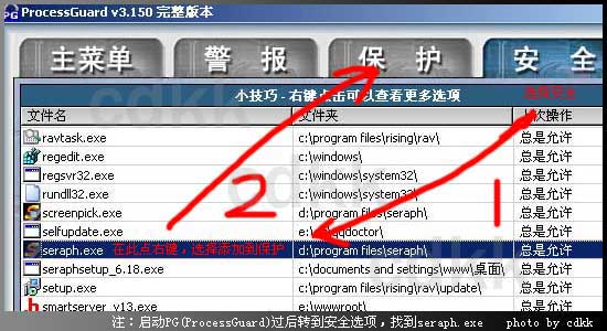 第一步:安装好processguard后,点安全找到seraph在上面点右键,选择添加到保护。