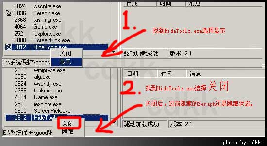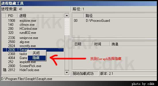 2,打开HideToolz如下图,找到seraph的进程。选择隐藏。