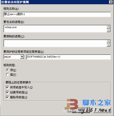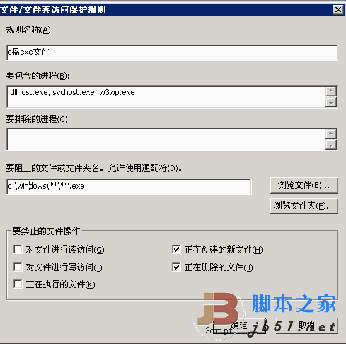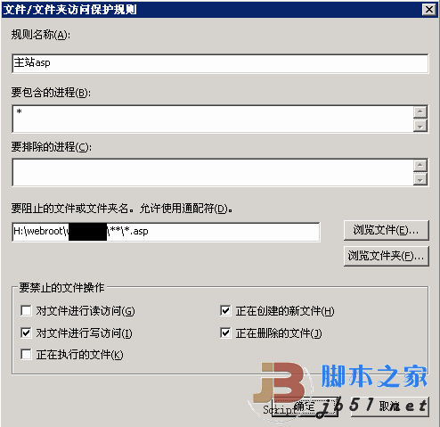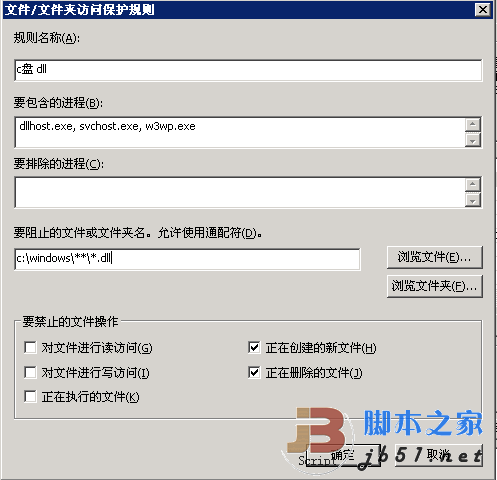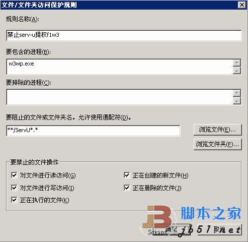这个包括的进程是*表示任何程序,ftp也不行,彻底解决问题,但这样比较针对于有服务器控制权限的用户,一般情况下 w3wp.exe代码不让通过在线修过即可。