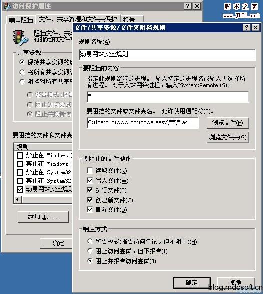 响应方式:阻止并报告访问尝试如果还不放心,可以将系统盘里每个根目录文件夹都创建一个规则。禁止黑客对他们进行任何操作。具体就不一一列举里。这样设置,除非黑客能破坏咖啡,或者黑客知道咖啡密码,更改咖啡设置,才能进行进一步破坏活动。如果黑客想破坏咖啡,决非易事。用过咖啡的人知道,咖啡不能被退出进程,只会持续工作。当然黑客可以通过卸载咖啡来破坏,问题是,黑客进行远程卸载,必定调用exe之类文件,而咖啡是不允许黑客远程对exe之类文件进行任何操作的。偶使用咖啡不久,曾被一个黑客入侵,那时还不懂得设置如此严厉的规则,只是打开咖啡默认的对exe、dll文件保护规则,那个黑客都没有干成什么。如果能建立这样严厉的规则,黑客所能做的事情将会非常非常少哦。