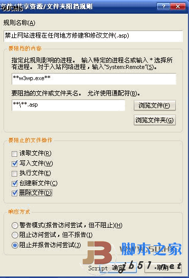 规则名: 禁止网站进程在任何地方修建和修改文件(.asp) 这个随便写的