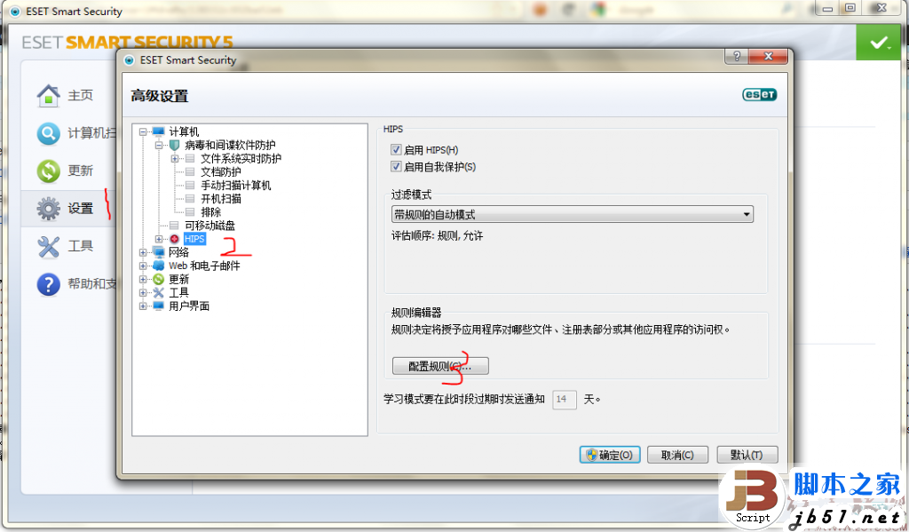 在nod32上选择“设置”,“进入高级设置”,选择“计算机”,“HIPS”,“配置规则”