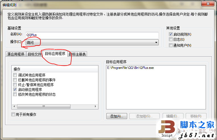 由于是QQ启动QPlus的。所以源程序选择QQ,(如E:\ProgramFile\QQ\Bin\QQ.exe)目标应用程序选择被启动的QPlus(如E:\ProgramFile\QQ\Bin\QPlus.exe),动作可选禁止等。